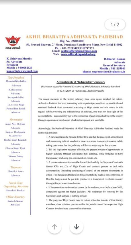 उच्च न्यायपालिका में हाल की घटनाओं ने एक बार फिर देश को झकझोर दिया है। अधिवक्ता परिषद विभिन्न क्षेत्रों के महत्वपूर्ण व्यक्तियों से बातचीत कर रही है और इस संबंध में उच्च न्यायालयों और ट्रायल कोर्ट में वकालत करने वाले अधिवक्ताओं से फीडबैक प्राप्त कर रही है। न्यायपालिका की स्वतंत्रता की रक्षा करते समय, किसी को भी जवाबदेही की अनदेखी नहीं करनी चाहिए – प्रत्येक व्यक्ति की अंतरात्मा के प्रति नहीं बल्कि समाज के प्रति जवाबदेही एक स्थायी तंत्र के माध्यम से जो पारदर्शी और सत्यापन योग्य हो। तदनुसार, अखिल भारतीय अधिवक्ता परिषद की राष्ट्रीय कार्यकारिणी ने निम्नलिखित मांगें कीं: