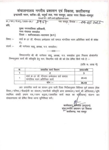 नगर पंचायत कसडोल के वार्ड क्रमांक 7 डॉ भीम राव अंबेडकर वार्ड में अतिरिक्त भवन की हुई स्वीकृति, भवन निर्माण की स्वीकृत 26.43 लाख की लागत राशि से निर्माण होने वाली है, आपको बता दे कि भवन निर्माण की स्वीकृत 2015 पूर्व में 10 साल पहले हो गई है, लेकिन भवन निर्माण की कार्य अधूरी रह चुकी थी, नगर पंचायत कसडोल में पहले कार्यकाल 2015 से 2020 तक में निर्दली अध्यक्ष थे,फिर काग्रेस अध्यक्ष रहे फिर भवन निर्माण कार्य अधूरी रह चुकी थी,फिर नगर में बीजेपी के अध्यक्ष अब कुर्सी सम्हाल रहीं हैं, बीजेपी की सत्ता का असर अब कसडोल नगर में दिखाई दे रही है, नगर पंचायत अध्यक्ष नागेश्वर साहू ने जनता के साथ जो जो वादे किये थे, उन सभी वादो को पूरा करने का प्रयास कर रहे हैं,नगर पंचायत कसडोल में बीजेपी के अध्यक्ष बनते ही ,नगर में अनेक प्रकार की निर्माण कार्य के लिए भूमि पूजन कार्य संपन्न हुवे है, जल्द ही नगर में स्वीकृत कार्यों को अमलीजामा पहनाने का कार्य किया जायेगआ ।