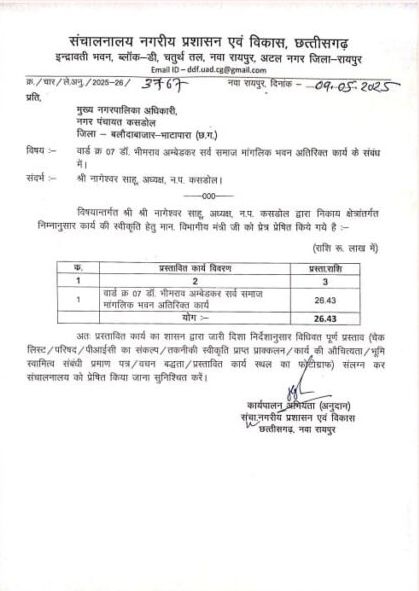 नगर अध्यक्ष नागेश्वर ने जानकारी दी कि वार्ड क्रमांक 7 में स्थित भवन निर्माण की कार्य विगत 10वर्षों से हो गई थी, लेकिन कार्य अधूरे रहा गया था, अध्यक्ष बनने के 2 महीने बाद तत्काल भवन निर्माण कार्यों के लिए नगरीय प्रशासन मंत्री अरुण साव को अवगत कराया गया, नगरीय प्रशासन मंत्री अरुण साव अपने संज्ञान में लेते हुए कार्यों के लिए आदेश जारी किए, नगर अध्यक्ष नागेश्वर साहू ने पूर्व विधानसभा अध्यक्ष गौरी शंकर अग्रवाल,मंत्री अरुण साव का जताया आभार ।
